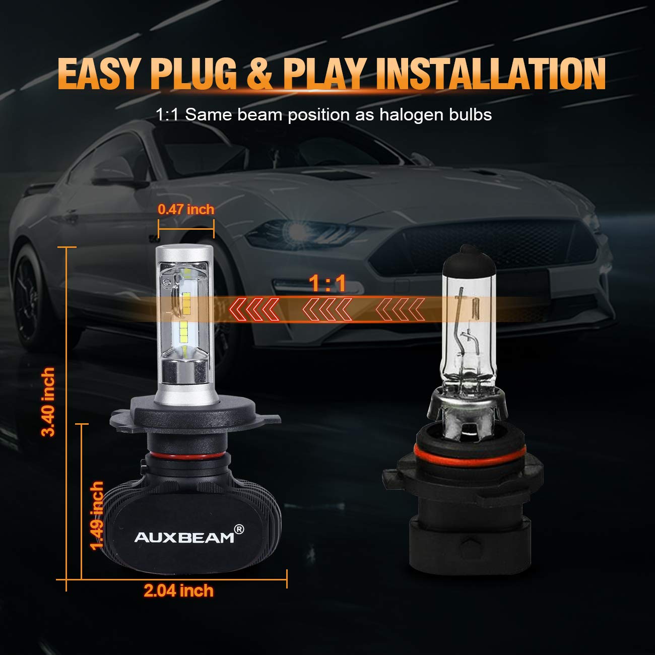 - Warranty: We offer two year warranty. If you have any questions, please feel free to contact us. WARM TIP: Before purchase Auxbeam H4 9003 led, please check the correct plug size of your car. And check the bulb size of vehicle to ensure bulb has enough space for installation (refer to our product size image)