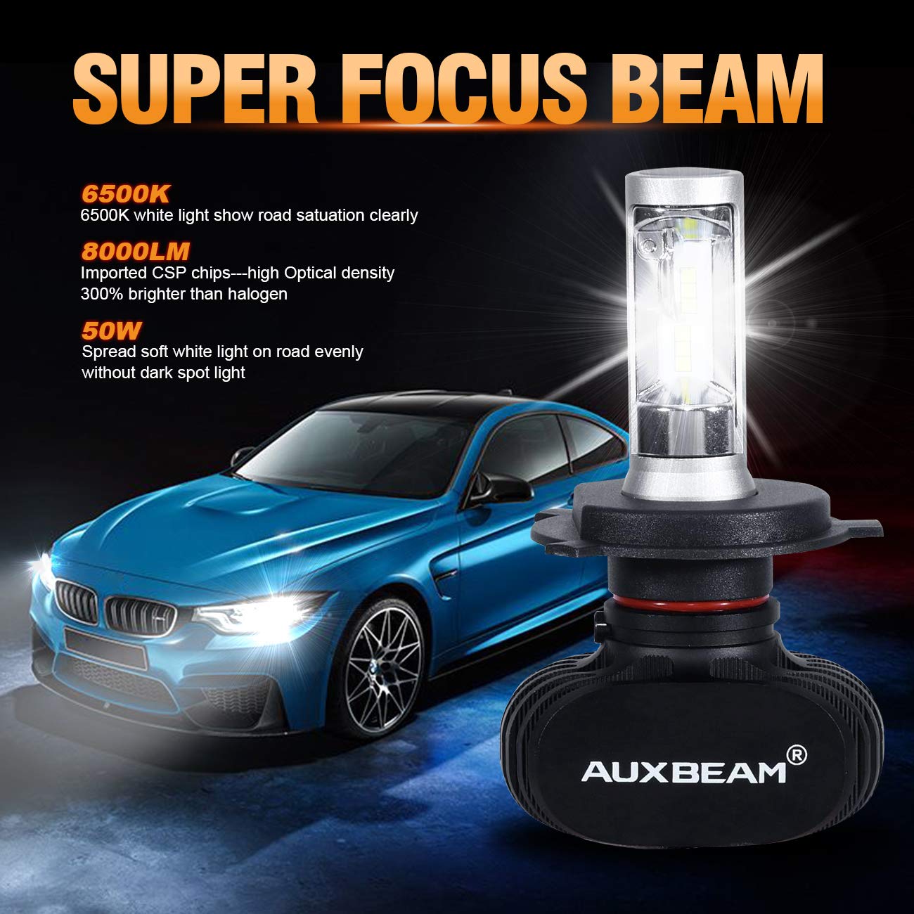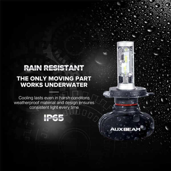 - IP65 Waterproof and Dust Seal: 2x H4 9003 LED bulbs when working under temperature -40C~+150C degree Celsius for above 30,000 hours life time, and with rubber ring seals, shock resistant. Auxbeam S1 H4 9003 LED bulbs conversion kits to offer you a clear view sight and feel safety, you can use it freely in heavy rain