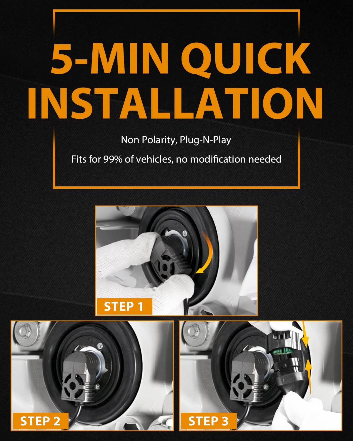 • 5 Minutes Quick Installation: Original halogen lamp size with stable light source, Easy installation without any modification, perfectly fit into your housing and factory sockets, and even in tight spaces