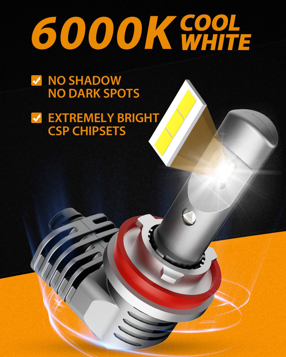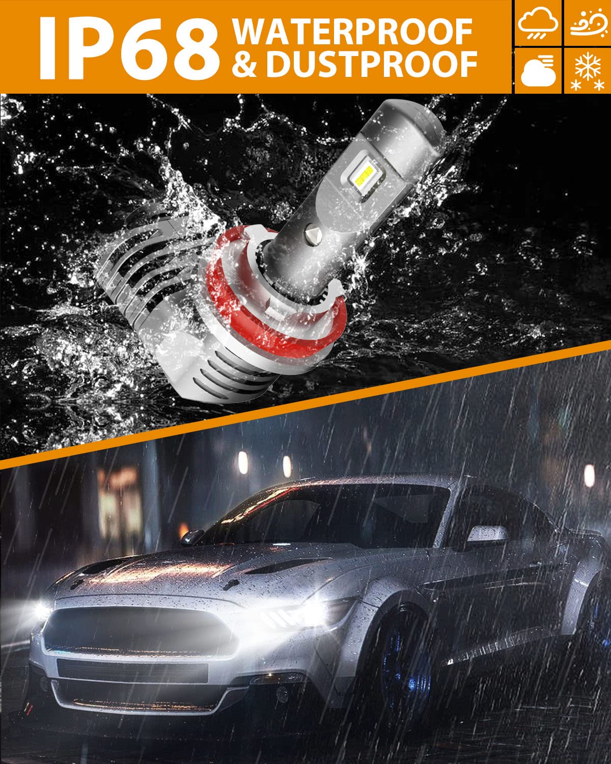 • High Brightness No Glare: P10 series H8/H9/H11 led bulbs each with 6pcs double-sided CSP customized led Chips, 360-degree clear beam no blind zone. Luminous Flux: 15000lm/set(7500lm/bulb), more than 50000 hours life time, IP68 water and dust proof